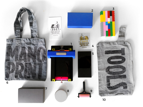 2. 100 piezas cartulina 216g 3. base de legos 4. placa de polímero 9x5cm (con tu diseño vectorial) 5. base de acrílico para montar polímero 6. bolsa para manoprint 7. 50 piezas papel de algodón 300 g 8. lata de tinta 9. mini rodillo 10. bolsa para guardar las tuls |